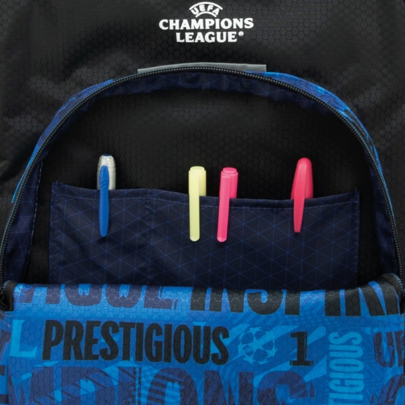 Bolsillo organizador interno con bolsillo, hueco para bolis y cuelga llaves. Etiqueta identificativa de Champions Bolsillo lateral para botella. Tiras reflectantes Lavable